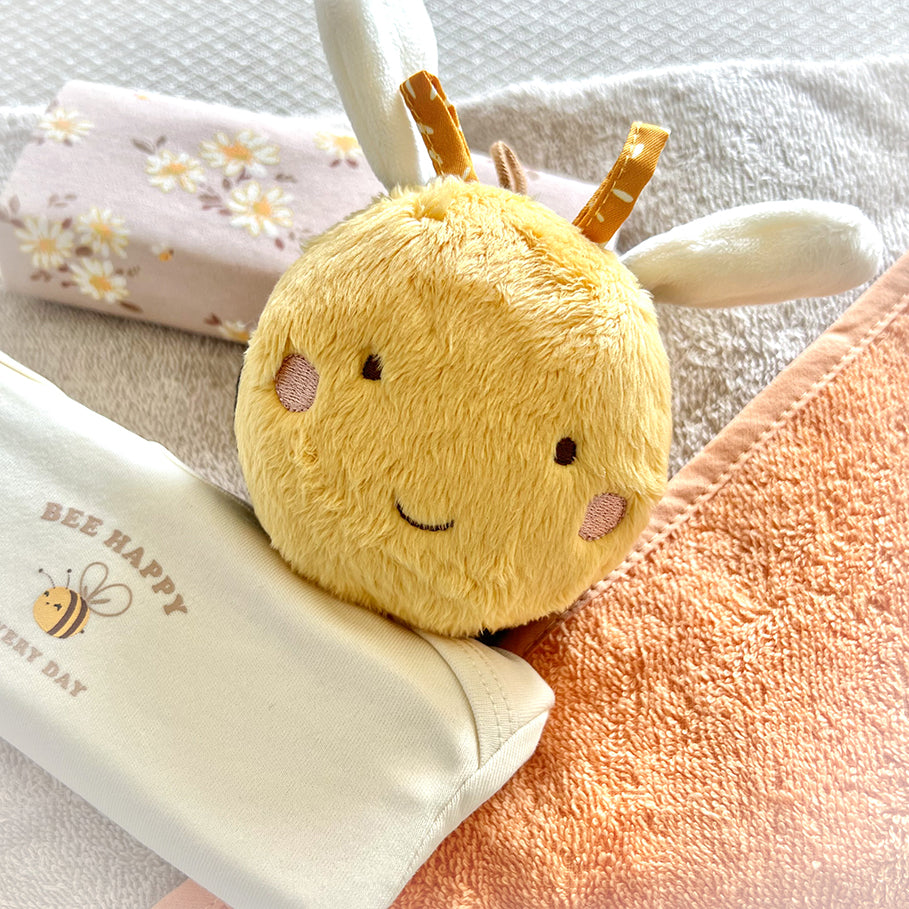 Der softe Plüschball in handlicher Größe hält Babys in Bewegung. Die süße Biene hat eine Quietsche im Bauch, die beim Zugreifen fröhlich quietscht, und Knisterfolie in den Flügelchen. Mit praktischen Schlaufen zum Aufhängen und liebevoll gestickten Details.